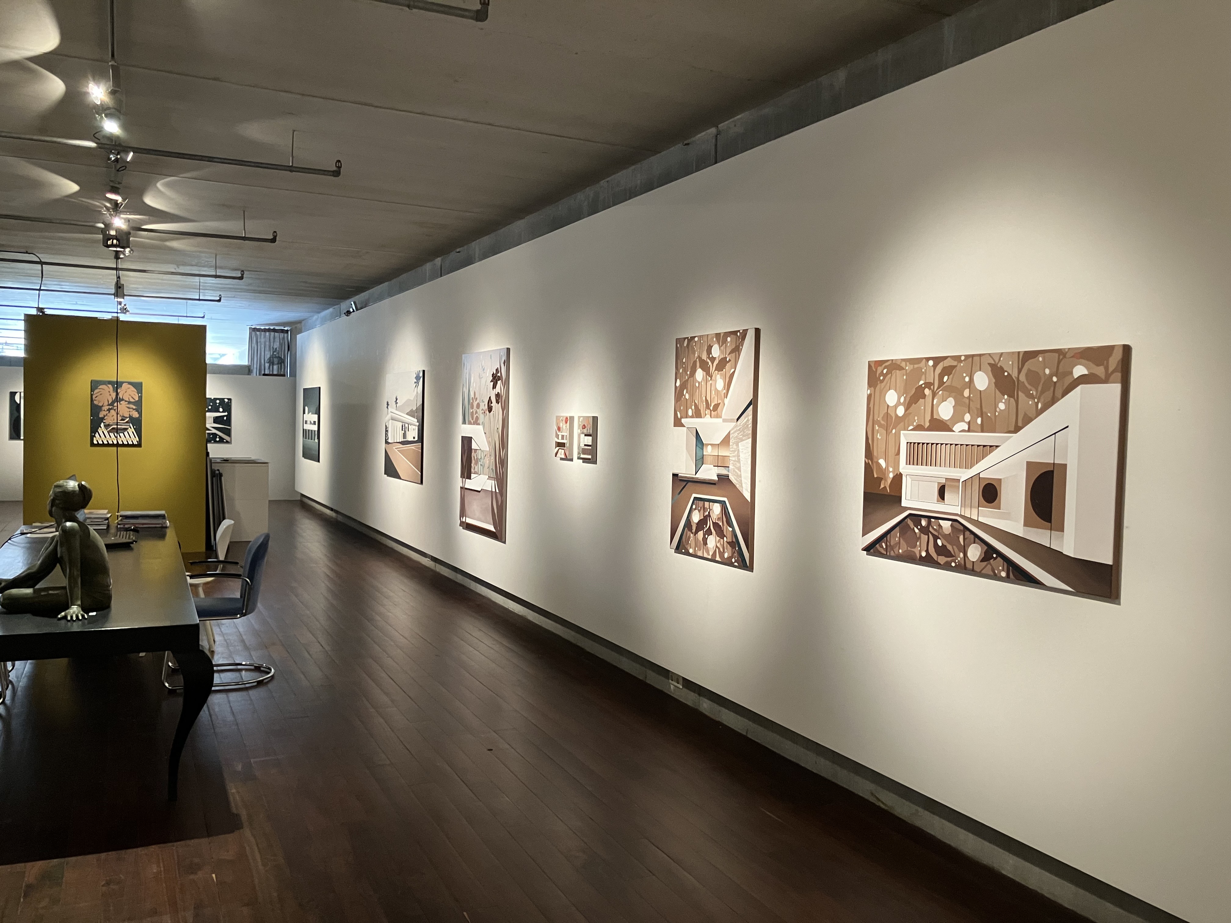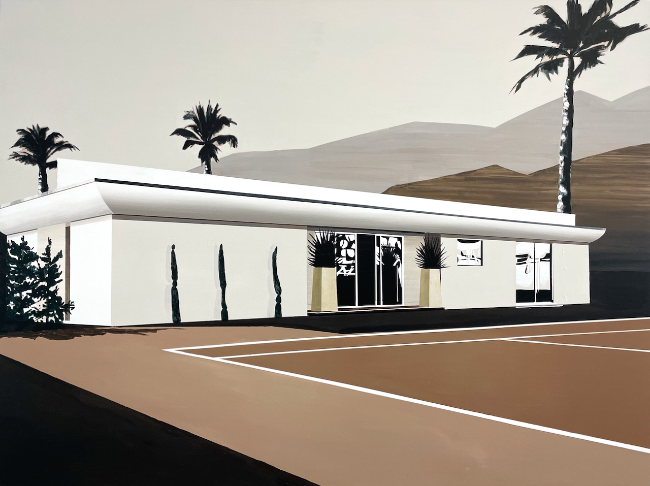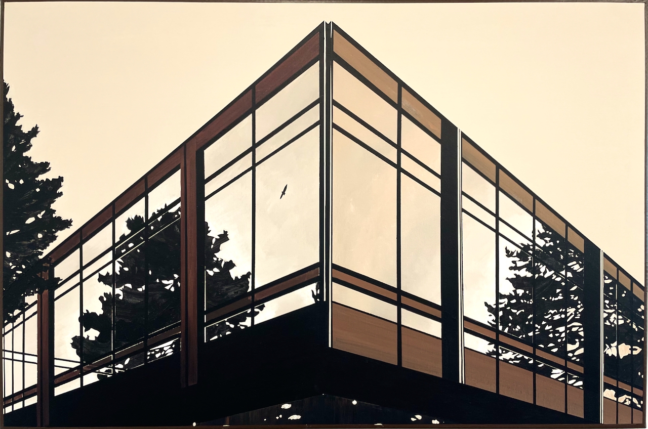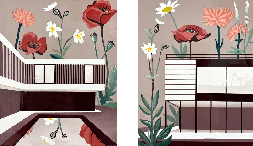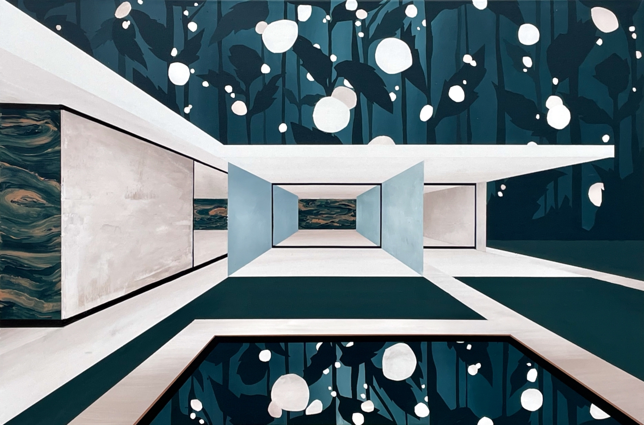 De schilderijen van Bonnie Severien verbeelden een nieuw paradijs waarin modernistische architectuur en overdadige natuur samensmelten. Strakke lijnen en organische vormen vloeien samen tot serene oases, los van tijd en menselijk ingrijpen.